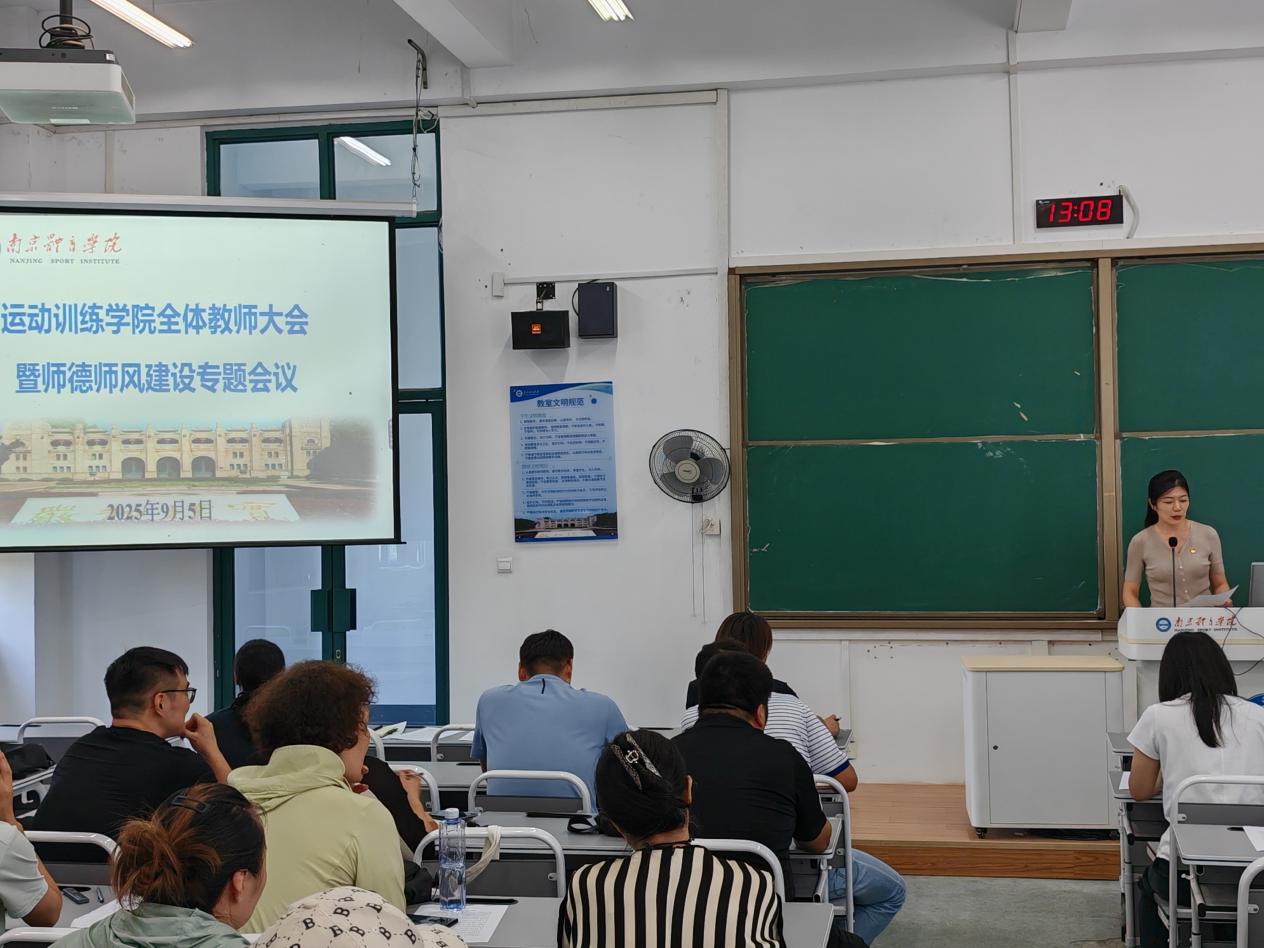 9月5日,运动训练学院全体教师大会暨师德师风建设专题会议在仙林教学楼C301召开。会议总结暑期工作、部署新学期任务,尤其聚焦师德师风建设,为新学期育人工作定向领航。