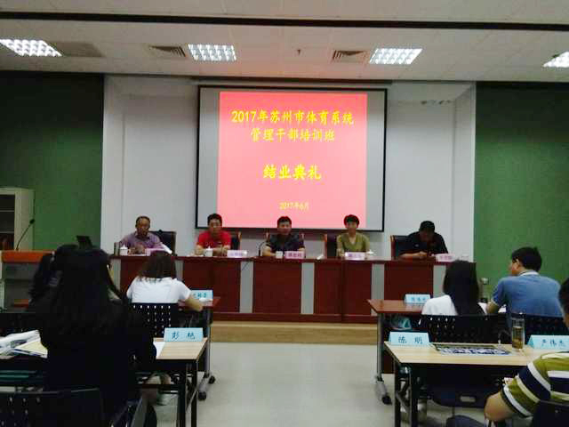 2017年苏州市体育系统管理干部培训班(第一期)于6月26日至30日在我院中国网球学院举行。6月30日上午,培训班举行结业典礼。我院副院长、中国网球学院院长蒋宏伟出席结业典礼并作总结讲话。苏州市体育局局长周志芳等领导对此次培训工作给予了充分肯定。学员代表对培训期间的学习情况进行总结汇报,一致认为这次培训课程对今后改进苏州体育系统管理工作具有重大意义。中国网球学院对此次培训给予了极大的支持。