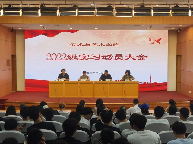 9月8日上午,武术与艺术学院在图书馆第一报告厅召开2022级实习动员大会。本次会议由学院党政领导班子、2022级实习带队教师及该年级全体学生共同参加,教学秘书谭晓雪主持。