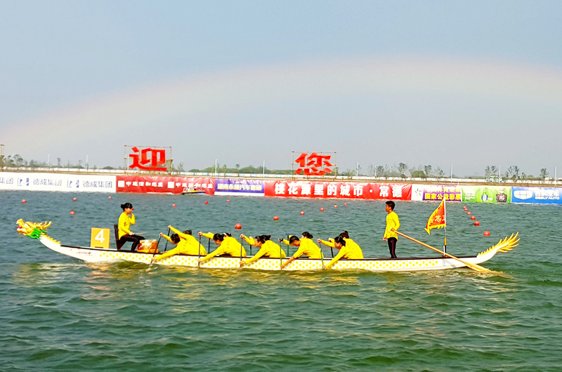 彩虹下,女子12人小龙舟进入赛道