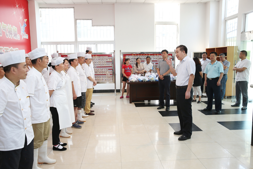 在慰问中,党委书记朱传耿发表慰问讲话。他说,今年南京体院面临两大中心工作,一是备战十三届全运会,另一个是迎接教育部本科审核评估。暑期的工作安排是南体近年来最为繁重的一年,后勤保障和安保工作非常关键,任务艰巨,责任重大,大家在完成工作任务的同时,首先要保证安全。食堂要高度关注食品的安全,包括食材的安全、加工的安全、管理的安全。场馆、车队、维修、装备等保障要保证施工的安全、消防的安全、治安的安全、交通的安全。安保保障要做好北区全运备战的安全保障、南区校园施工的安全保障、学院各进出关口的安全保障,要做好夜间的巡查、重点区域的巡查、重点场合的巡查、重点时段的巡查,确保校园的安全。大家要发扬南体人特别能吃苦、特别能战斗、团结拼搏的精神,克服困难,科学安排,圆满完成暑期的工作安排。今年的夏天特别炎热,酷暑难耐,气温居高不下,大家战高温斗酷暑,坚守在工作岗位,非常辛苦。希望大家在做好工作的同时一定要做好防暑降温,保重身体。对于大家的辛勤努力,朱书记代表学院党委向大家表示衷心感谢,并表示要与大家一起为圆满完成省委省政府和省体育局下达的全运会任务指标共同努力。