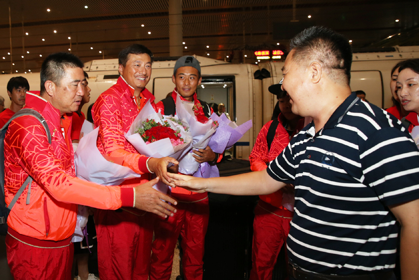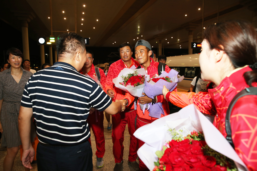 因为车次较晚,网球队抵达南京南站已将近深夜,连日比赛鏖战加上旅途劳顿,虽已十分疲惫,但个个脸上洋溢着胜利的喜悦。网球队的小队员为他们送上了鲜花。朱传耿书记与大家一一握手,向大家表示亲切问候,感谢大家克服困难,敢于拼搏,勇于超越,打出了南体人的气势和水平,赢得来之不易的好成绩,取得运动成绩和精神文明的双丰收,为南京体院和江苏人民争光添彩。肖爱华副院长也兴奋地与大家亲切握手致意,向大家表示热烈祝贺。
