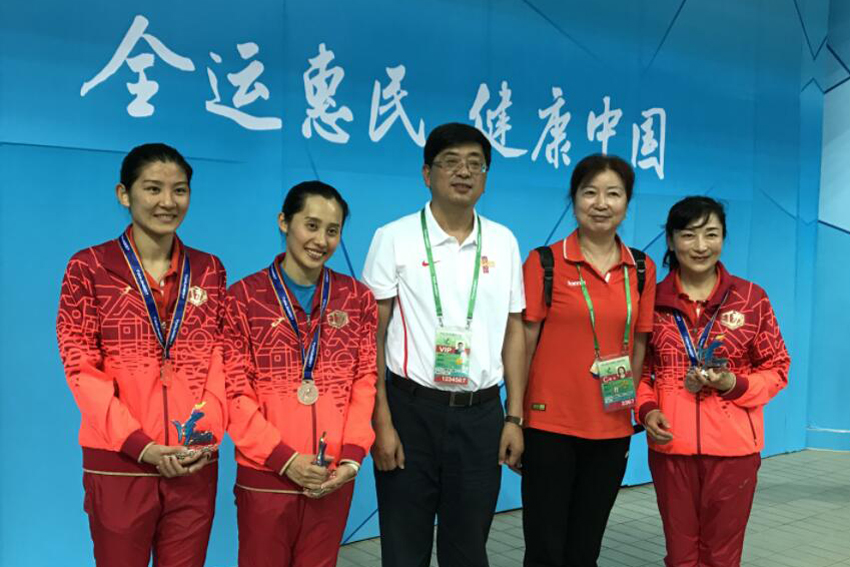 屈琳/孙梦晨和教练徐洁在领奖台上