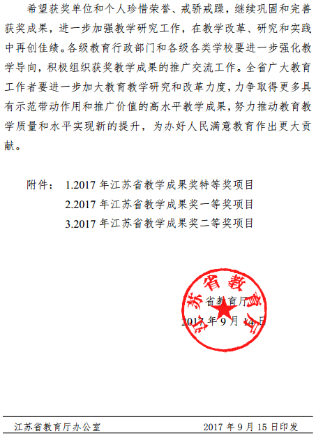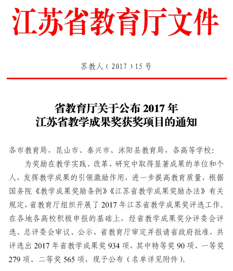 PA视讯于2013年开展了本科专业综合能力评价标准与测试方法的研制工作,并于当年开展学生技能测试,通过这一人才培养工作抓手,在全校师生的共同努力下,经过4年的实践,学生的综合能力得到了显著提高,我院学生在学科竞赛、专项竞赛、创新创业、实践教育、升学就业等人才培养方面取得了喜人的成果,这一实践获得2017年江苏省教育教学成果奖一等奖。该成果由副校长史国生教授领衔的团队完成。