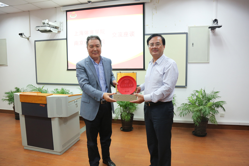 朱传耿书记向上海体育学院党委书记戴健赠送纪念品