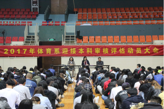 10月16日中午,体育系在体育馆召开迎接本科审核评估动员大会。体育系党总支书记、主任沈鹤军,系党总支副书记陈荣梅,系副主任王进出席会议并做迎接本科教学审核评估动员讲话,体育系全体辅导员、班主任和全系学生参加了此次会议。