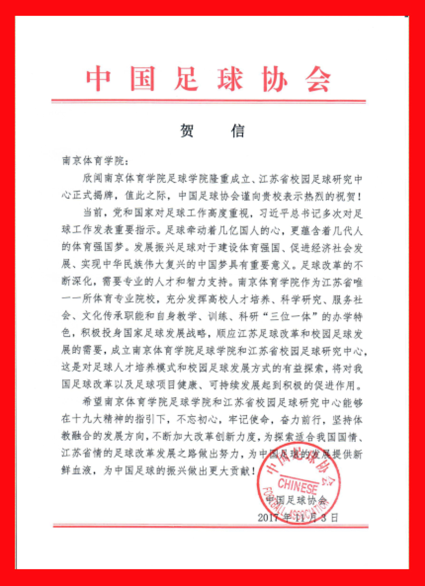 中国足球协会专程发来贺信