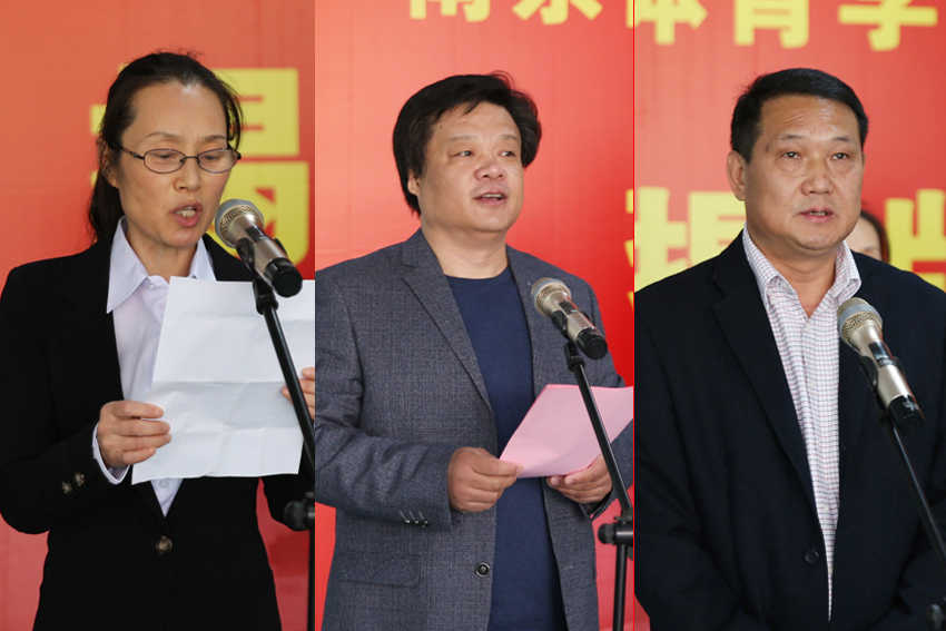 于翠兰主任汇报工作情况(左);唐芒果副主任主持揭牌仪式(中);包青波总经理讲话(右)