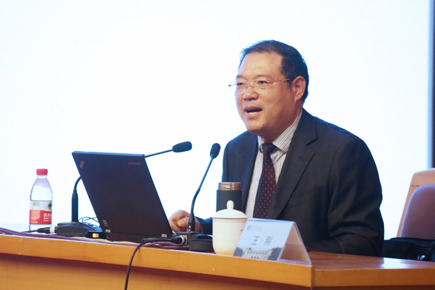 会上,王刚教授作了题为《中国特色社会主义的新航向——学习党的十九大精神》的精彩报告。他介绍了十九大开幕会的情况,梳理“中国特色社会主义”一词的演进历程,重点以“新时代、新使命、新思想、新战略、新部署”为主线深入浅出地讲述了十九大精神。新时代是中国特色社会主义新的历史方位,新使命是中国共产党团结带领人民实现中华民族的伟大复兴,新思想是习近平新时代中国特色社会主义思想,新战略是中国特色社会主义发展的新“两步走”战略,新部署包括“五位一体”总体布局和内外条件保障的新部署。对“新时代、新使命、新思想、新战略、新部署”五个核心概念,王刚教授分别从哲学维度、历史维度、现实情况、应对策略等方面进行了详细的阐述。王刚教授的报告高屋建瓴、准确深刻,既以宏观视野深刻阐释了党的十九大提出的新理念、新目标、新任务,又结合当前实际对一些重点问题,特别是大家比较关心的问题进行了深入浅出的解读。