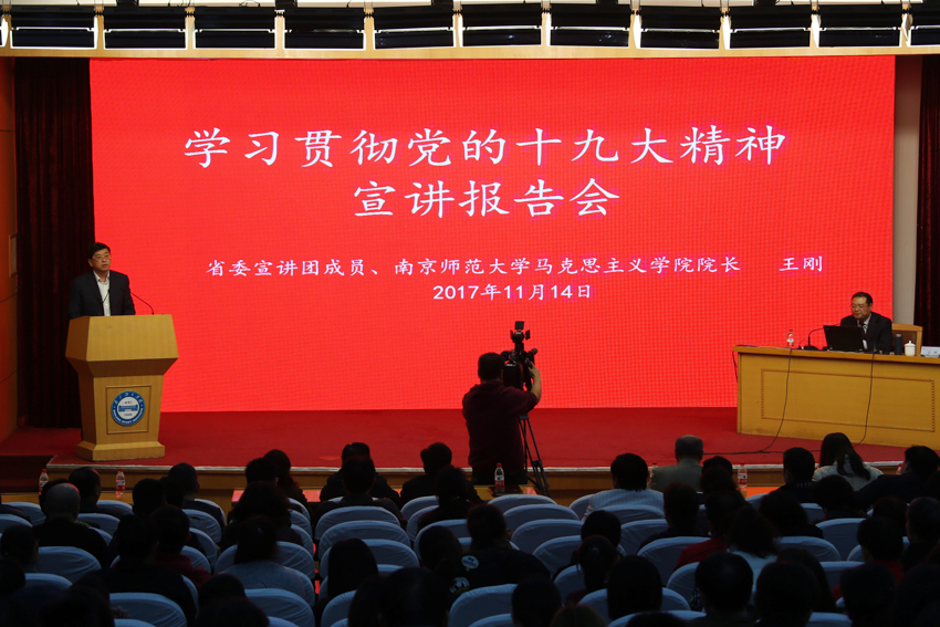 11月14日上午,省委宣讲团成员、南京师范大学马克思主义学院院长王刚教授来我院宣讲党的十九大精神。校长、校党委副书记杨国庆主持宣讲报告会。校党委常委汤岩、史国生、金松、肖爱华、潘林珍、黄步龙和省委宣传部讲师团主任科员陈曦出席。