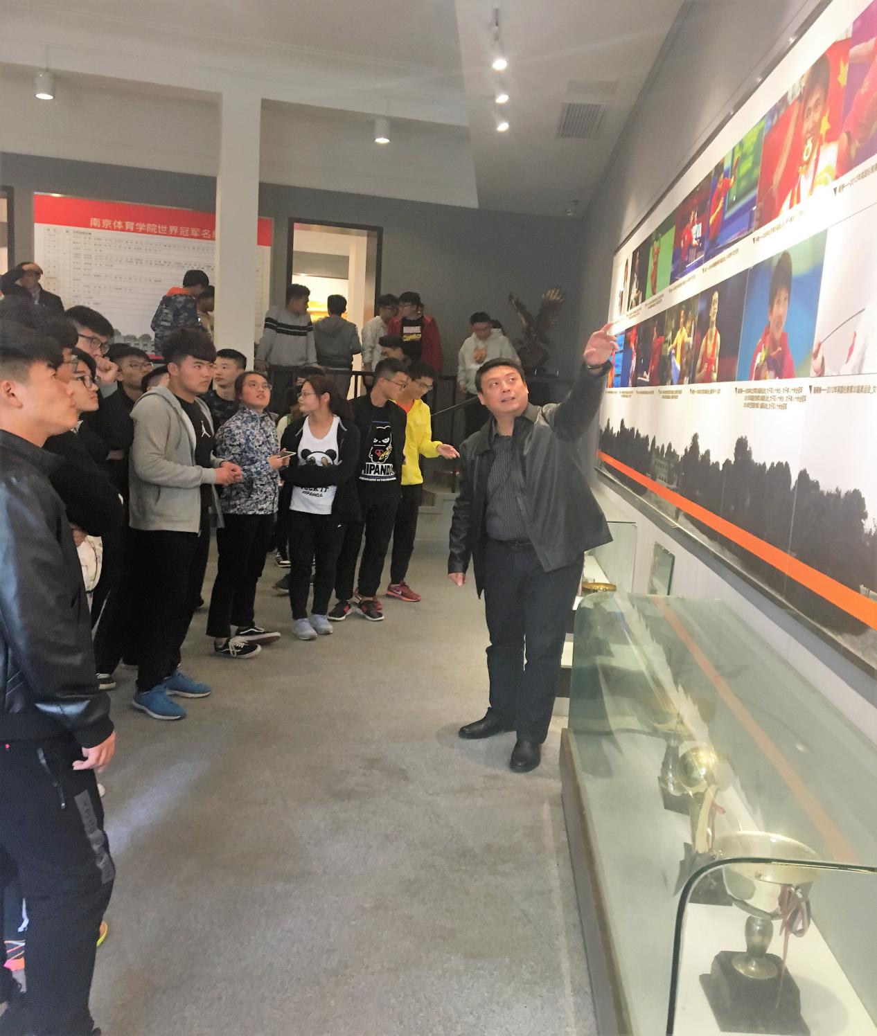 11月9日下午,体育系部分大一新生们在教学空余时间,趁着秋高气爽,在PA视讯训练处处长张健带领下,兴致高昂,整齐有序地参观了校史馆、体操蹦床馆、羽毛球馆以及中国网球学院。