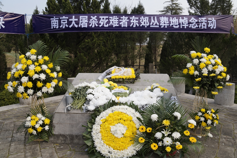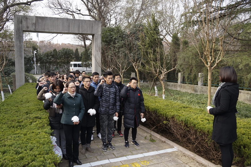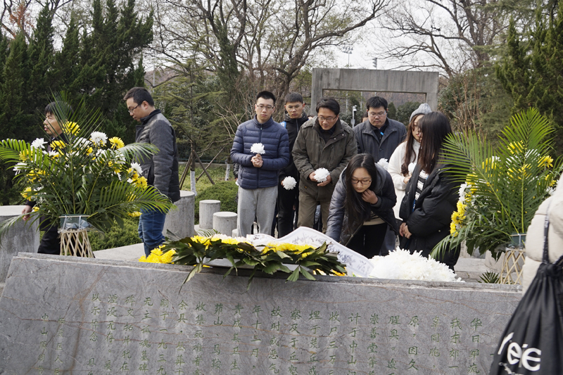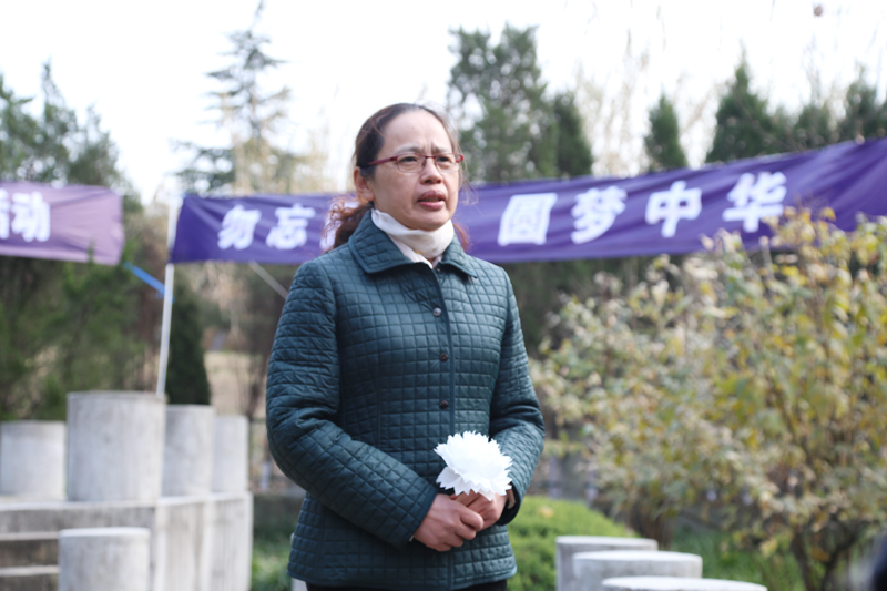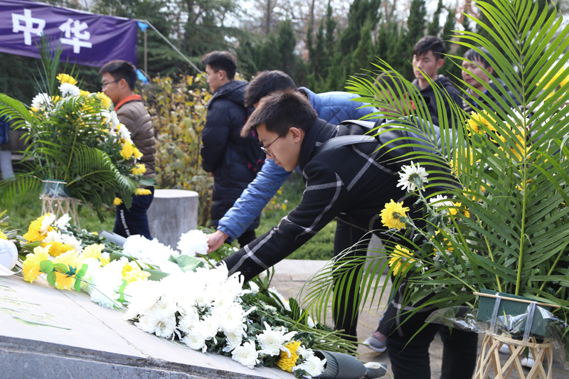 图文信息中心副主任、图书馆副馆长葛见珠带领现场师生庄严宣誓:好好学习,认真工作,铭记历史,珍爱和平。师生们紧握着自己做的白花,在丛葬地前庄严而沉重悼念逝者。
