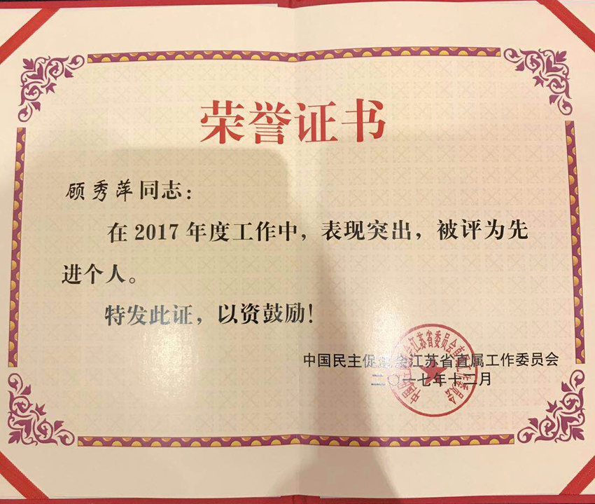 顾秀萍老师被民进省直工委评为“2017年度先进个人”