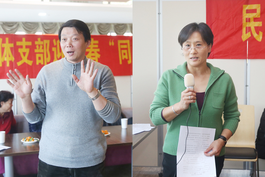 左:许立俊讲话;右:袁紫娟作民进南体支部2017年工作总结