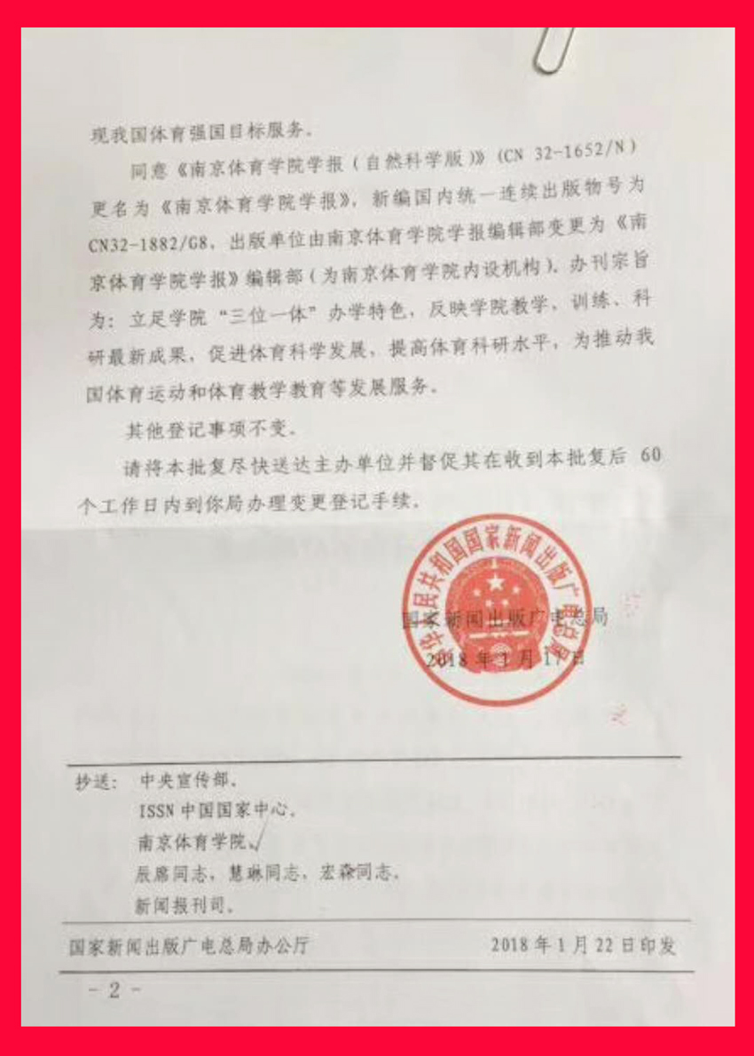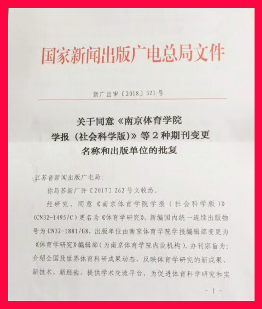 1月29日经国家新闻出版广电总局批准,《PA视讯集团入口学报(社会科学版)》更名为《体育学研究》,成为我国体育期刊首家以学科命名的期刊,介绍世界和中国体育科研成果动态,反映体育学研究的新成果、新技术、新经验,提供学术平台,为促进体育科学研究和实现体育强国目标服务。《PA视讯集团入口学报(自然科学版)》更名为《PA视讯集团入口学报》,立足学院“三位一体”办学特色,反映学院教学、训练、科研最新成果,促进体育科学发展,提高体育科研水平,为推动我国体育运动和体育教学教育等发展服务。