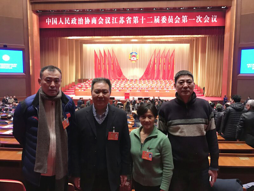 校党委书记朱传耿,体操队教练袁紫鹃,击剑队教练姚勇、张双喜四位十二届省政协委员在会场合影
