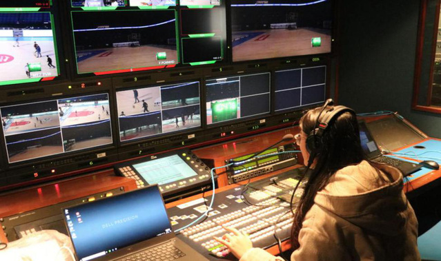 江苏体育休闲频道实习生在转播车内对不同机位进行镜头切换
