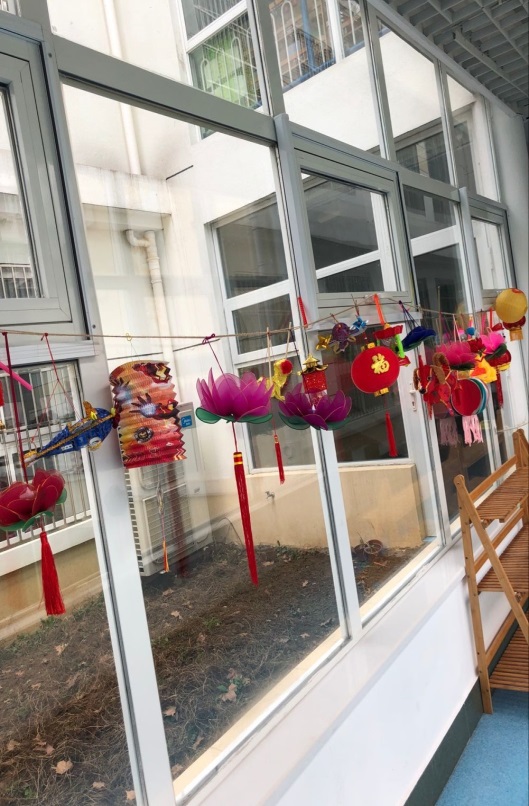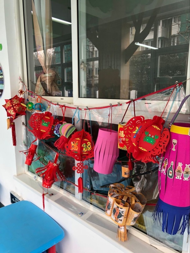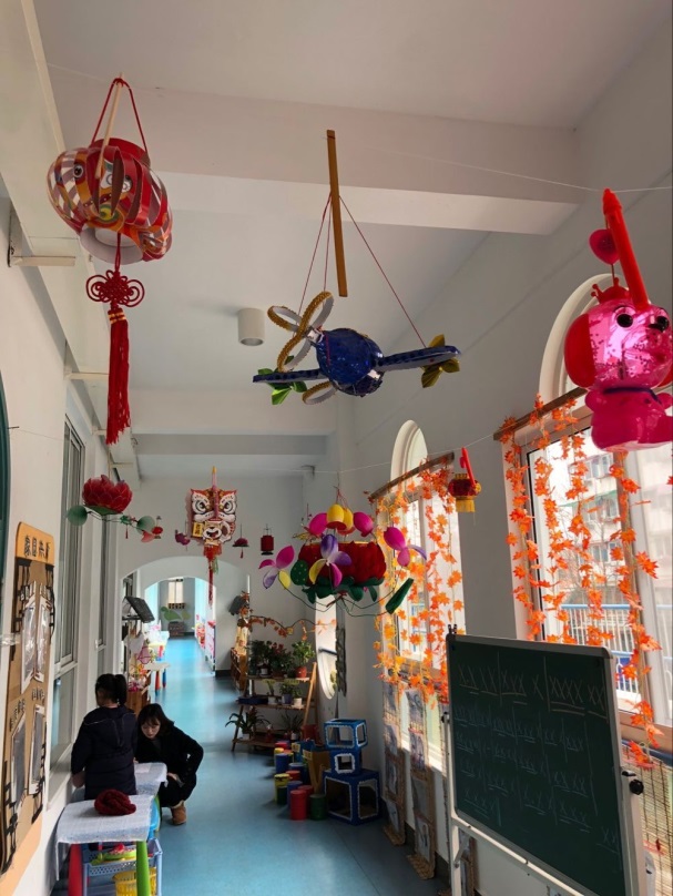 当天,幼儿园内装扮一新。大厅里、走廊上大红花灯高高挂起,红色心愿展板簇拥而立,显得格外喜庆;教室里,兔子灯、鲤鱼灯、红包灯……处处洋溢着节日的喜庆气氛。