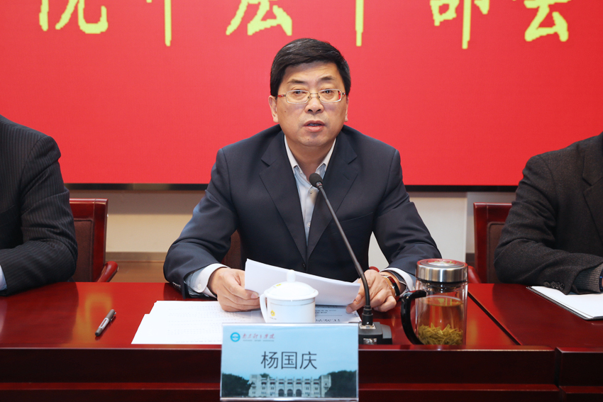 杨国庆就做好2018年工作强调了三点要求:一、统一思想,凝心聚力。要深入贯彻落实党的十九大精神,以习近平新时代中国特色社会主义思想为指导,勤于思考,勇于创新,敢于实践,以高度的主人翁意识和责任意识做好各项工作。二、明确职责,勇于担当。要坚持以学校年度发展目标为导向,以过程管理为重点,以绩效考核为抓手,强化组织领导、工作调度和考核督查,全面从严从实推进目标管理,确保目标任务落实到人、执行到位。三、狠抓落实,加强监督。要紧紧围绕目标进行安排部署,以出实效为着眼点和落脚点,创新工作思路,严格工作要求,努力做到工作落实的力度更大、速度更快、效果更好。