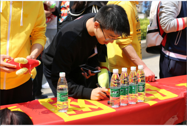 同学们在横幅上签名表决心