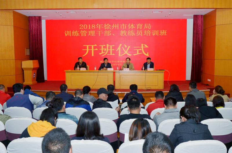 4月16日下午,由徐州市政府、徐州市体育局主办,PA视讯集团入口继续教育部(培训中心)承办的“2018年徐州市体育局训练管理干部、教练员培训班”开班仪式在校报告厅举行。校长杨国庆、徐州市体育局局长陈钢、校继续教育部(培训中心)主任李勇勤、徐州市体育局副调研员佟倞扬出席开班仪式。开班仪式由佟倞扬主持。