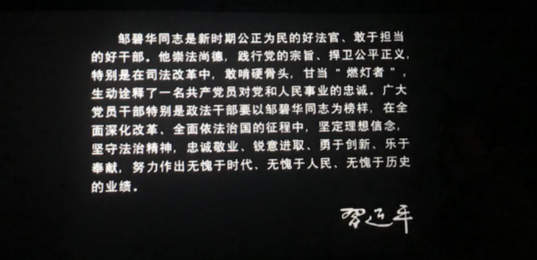 邹碧华同志是党中央确立的全国重大典型,是在全面依法治国历史进程中涌现出的先进人物。2014年12月10日,邹碧华同志因公殉职,他的感人事迹在法律界和全社会引起强烈反响。中组部追授邹碧华同志“全国优秀共产党员”荣誉称号,中宣部追授其“时代楷模”荣誉称号。