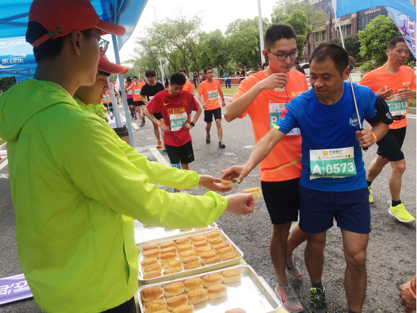 志愿者为参赛者提供补给服务