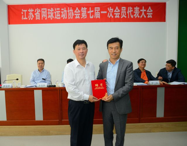 江苏省网球运动协会第七届理事会会长蒋宏伟先生为为副会长们颁发聘书。