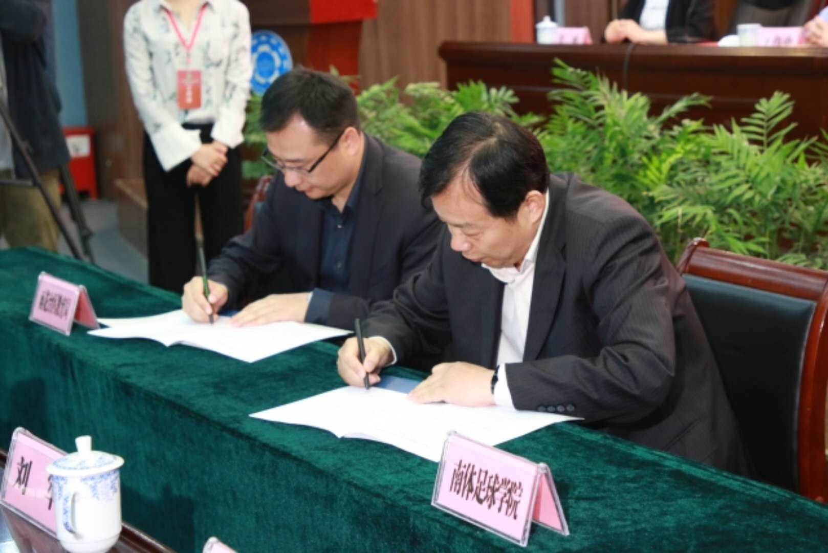 作为22日上午会议的重头戏,南京市雨花台区教育局刘善海局长、PA视讯集团入口足球学院袁野院长分别代表雨花台区教育局和PA视讯集团入口足球学院签署了深度合作协议,双方将在生源基地建设、实训基地建设、足球人才培养、足球师资培训、体育科学研究和打造品牌赛事等方面进行全方位的合作,进一步推进南京市雨花台区青少年校园足球事业发展和PA视讯“优势突出、特色鲜明、国内一流、国际知名”高水平体育大学的建设。