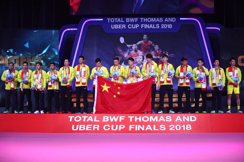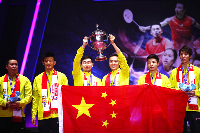 中国队捧得汤姆斯杯,石宇奇(右二)手持国旗