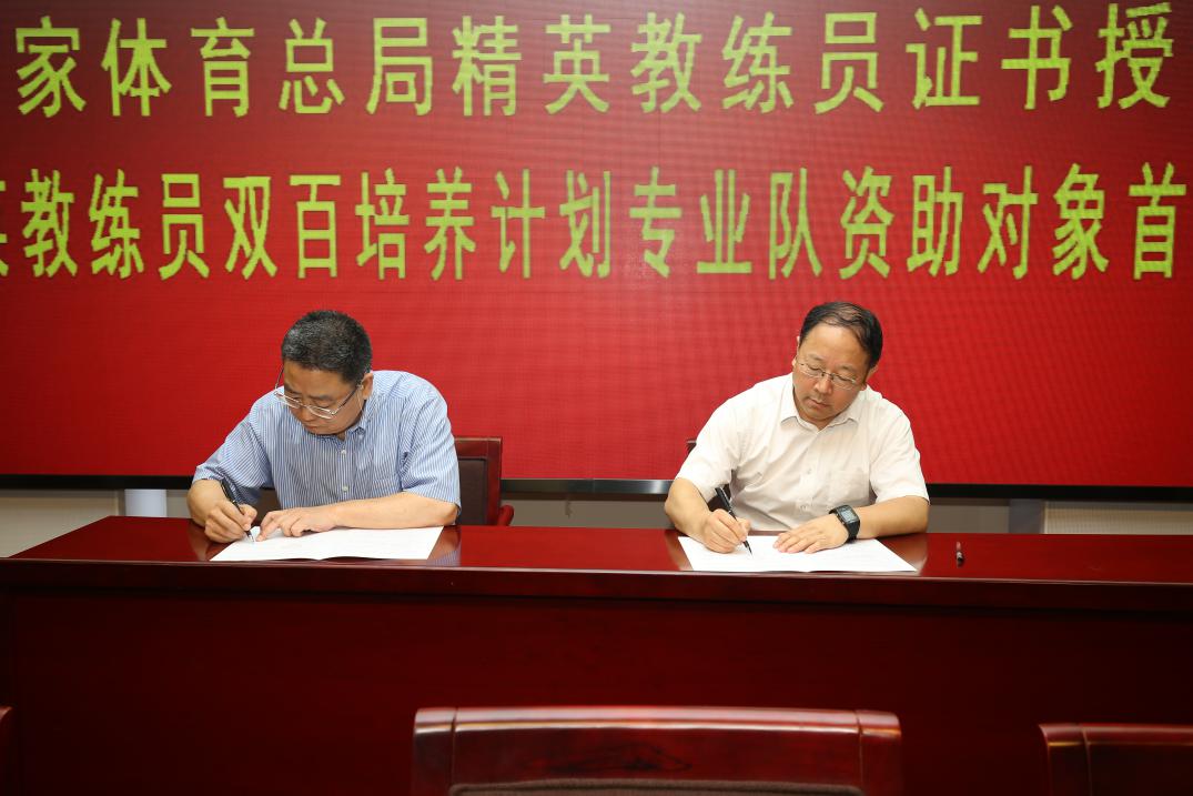开班仪式上,各领导为第一二期精英教练员颁发荣誉证书,竞体司与培养单位签订培养责任书。
