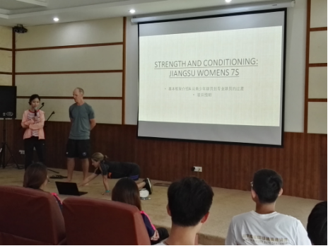5月24日上午十点,运动系在仙林训练基地运动员活动中心开展了体能训练和橄榄球运动损伤预防和治疗的讲座。运动系橄榄球专项、体能专项教师和学生聆听了来自新西兰顶级橄榄球俱乐部体能训练师Tony Burgess和理疗师Kendall Rose Stevenson针对体能训练和运动损伤与防治的知识讲座。