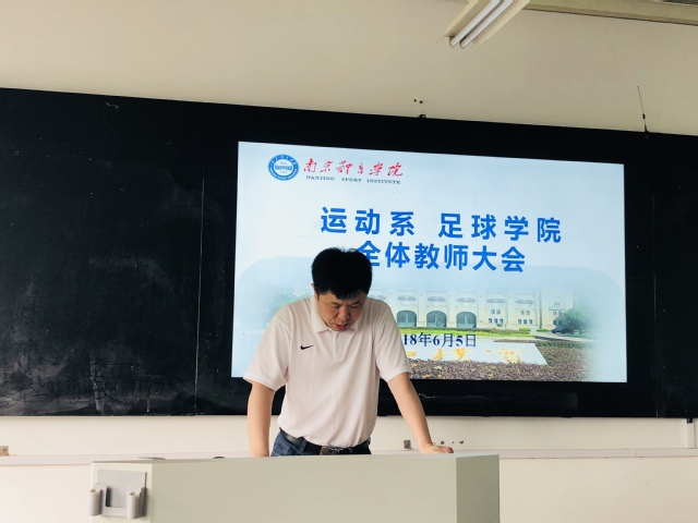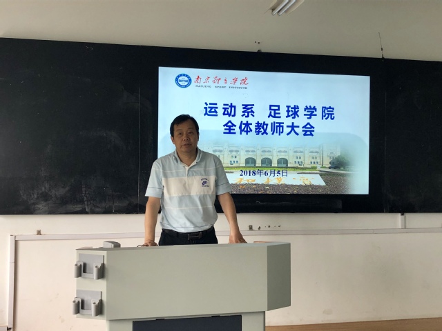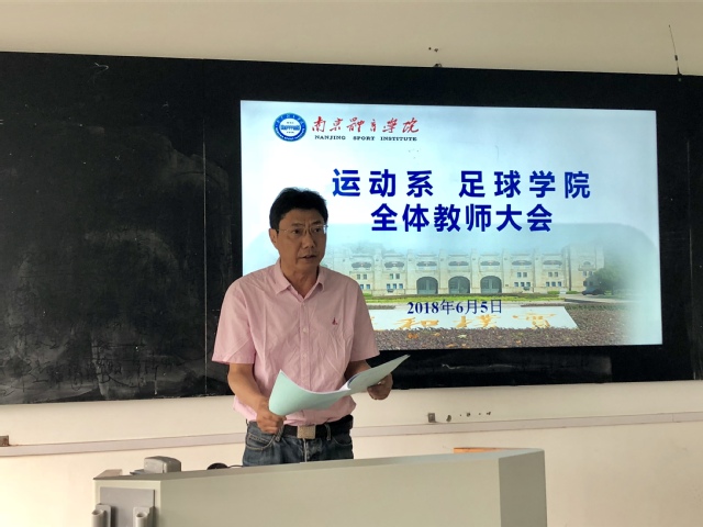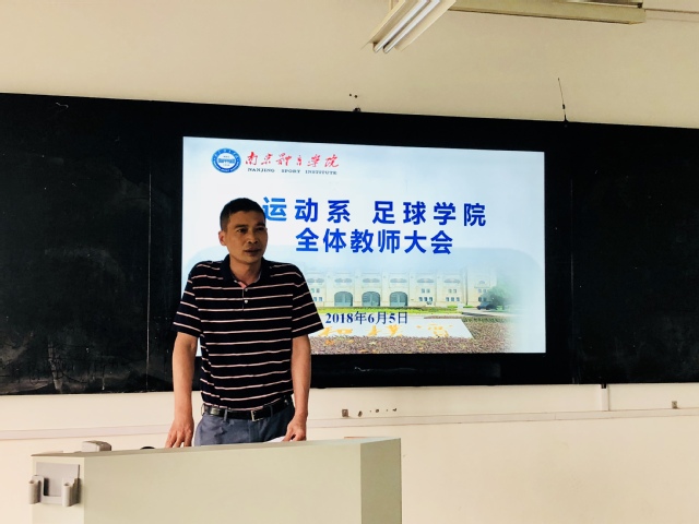 2018年6月5日中午12:30在仙林教学楼,运动系、足球学院召开了全体教师大会,运动系党总支书记、主任、足球学院院长袁野、足球学院副院长张亚军、运动系党总支副书记、副主任杨晖、运动系副主任张明以及运动系、足球学院的全体教师参加了会议。本次会议由运动系副主任张明主持。
