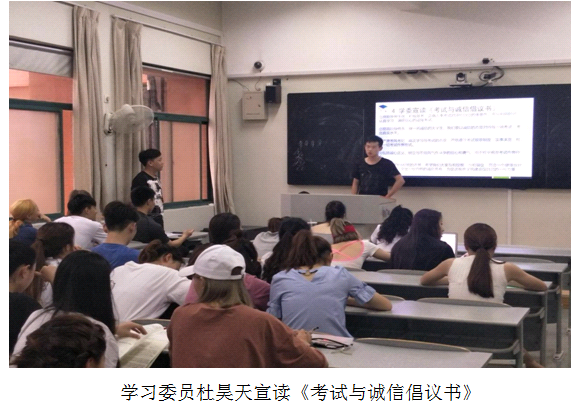 班会伊始,班主任张道鑫就本次班会主题进行发言,分别从近期学生的学习生活情况、期末考场纪律和要求以及学校职能部门开展“六联系”工作等方面进行了总结和解读。之后,班长朱楠从诚信考试的视角进行了发言,学习委员杜昊天宣读《考试与诚信倡议书》,希望我们每一位同学真正做到诚信做人,诚信考试。