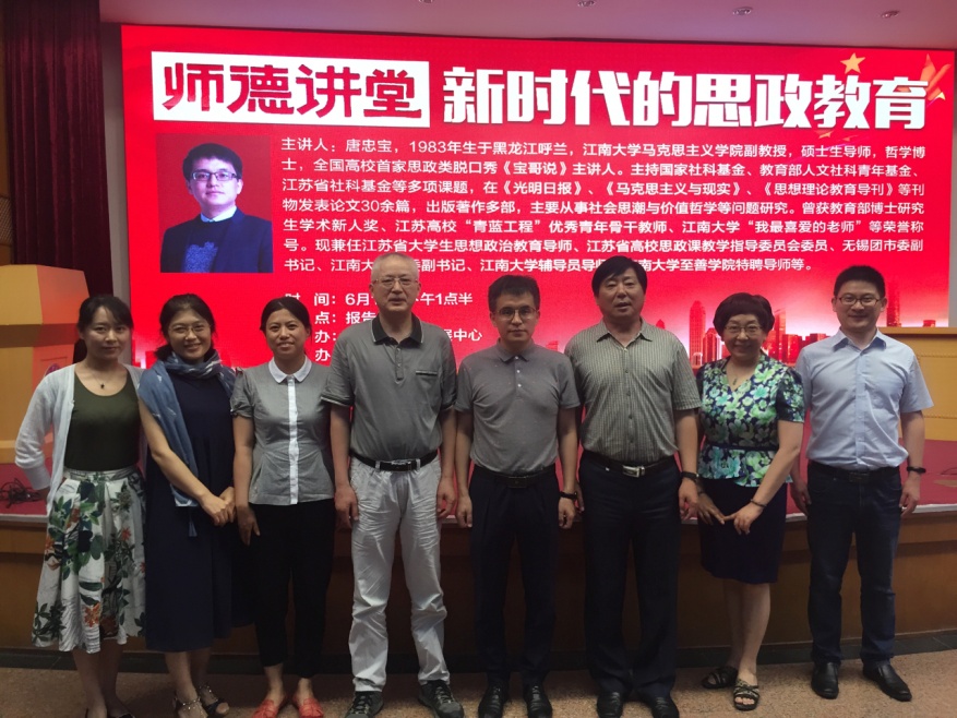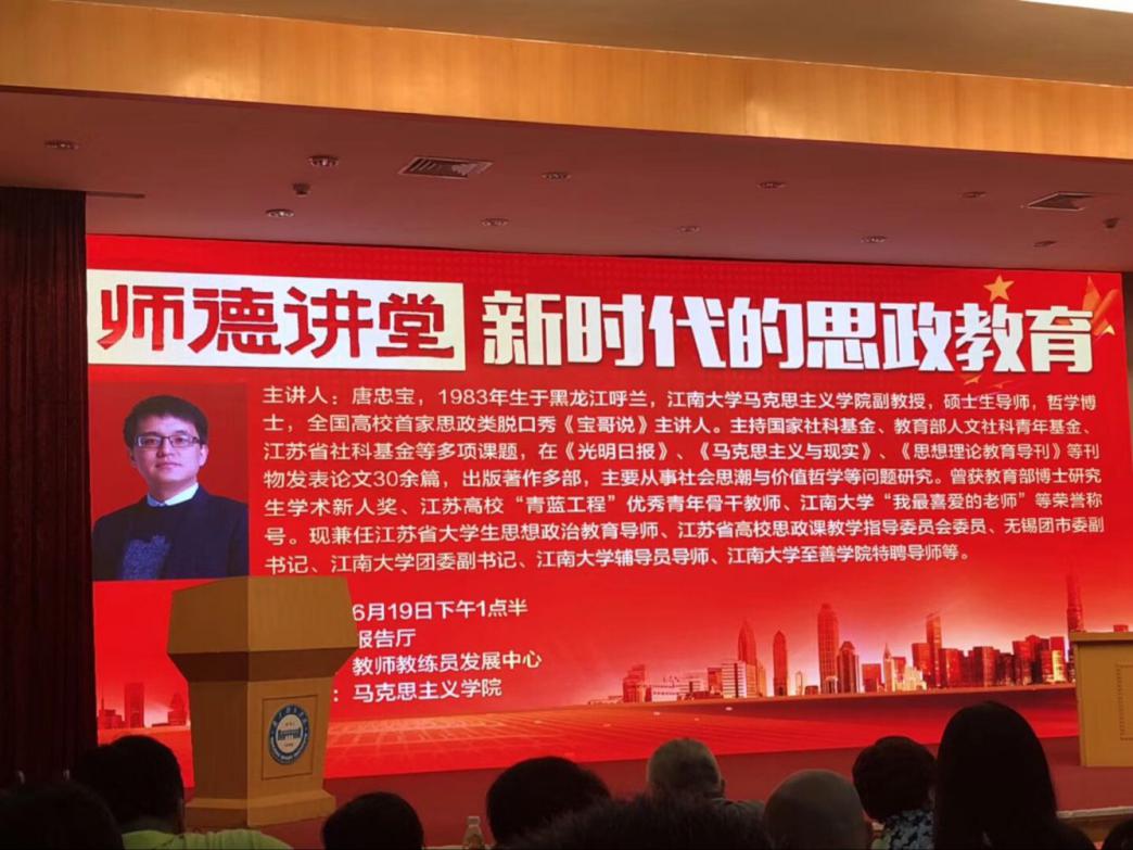 6月19日下午,校人事处教师教练员发展中心与马克思主义学院联合邀请了江南大学马克思主义学院副教授、硕士生导师唐忠宝在报告厅,与PA视讯教师畅谈新时代的思政教育。副校长史国生、人事处处长王成钢、马克思主义学院副院长葛翠柏以及各教学单位全体教师现场聆听了报告。