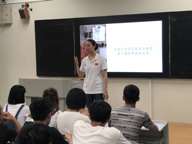 班主任朱乔老师要求学生们一要做到诚信考试,以寝室为单位现场签订了《诚信考试协议书》;二要落实假期注意事项,即登记好离校日期,买好车票,牢记下学期报到时间并按时报到;三要做好本周班级情况汇总。