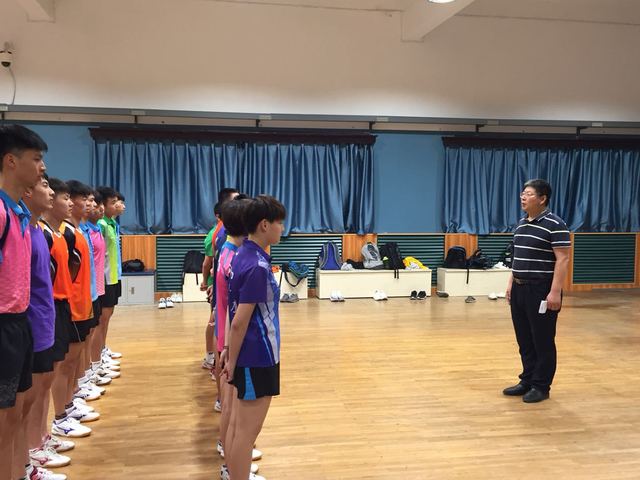 在领队指挥下,乒乓球队全体成员整队集合,高唱国歌,重温队训。