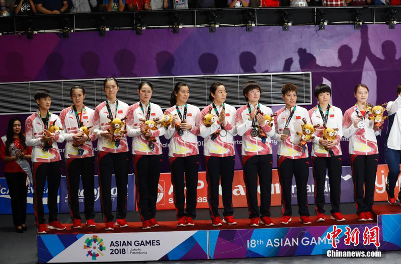 何冰娇(右四)、高昉洁(左三)、汤金华(左五)获羽毛球女子团体银牌