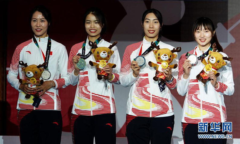 钱佳睿(左一)、杨恒郁 (左二)获佩剑女子团体亚军