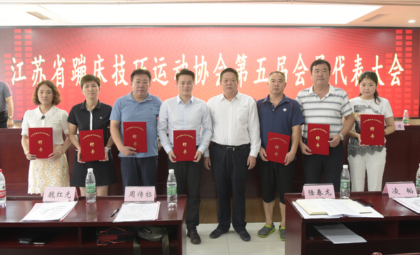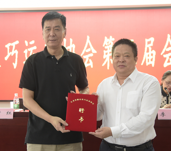 江苏省体育局副局长王伟中向江苏省蹦床技巧运动协会第五届理事会会长徐建先生颁发聘书