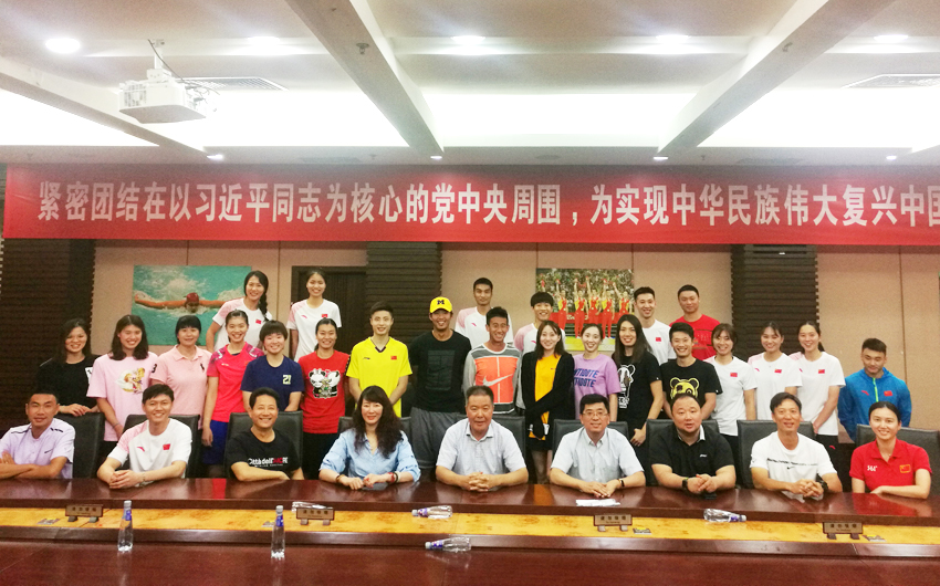 校领导赛前与参加亚运会的PA视讯教练员、运动员合影