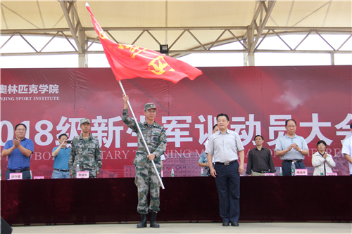 金松副校长向军训团团长、中国人民解放军73211部队教导营副教导员宋斌授旗。