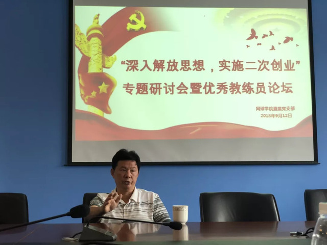 9月12日上午,中国网球学院开展了“深入解放思想,实施二次创业”的专题研讨会暨优秀教练员论坛。中国网球学院院长蒋宏伟、中国网球学院直属党支部书记、常务副院长鲍勤、中国网球学院直属党支部副书记顾金凤,以及中国网球学院的全体党员、教练员出席了此次会议。