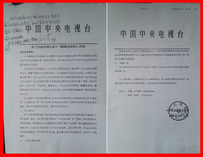 中央电视台关于协助拍摄纪录片《藏着的武林》的函