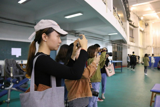 下午3:00,在不影响运动员训练的情况下,同学们首先深入的是校羽毛球队。一进入羽毛球馆,同学们就感受到了一股热火朝天的拼搏劲儿。正在接受训练的是很多与同学们年龄相仿甚至小很多的运动员,他们的每一次挥拍、每一次击打都充满了技巧感与力量感,这是他们每天坚持、不停重复训练的成果。在羽毛球馆不远处的体能与康复实验室中,有一部分运动员正运用器材进行着体能训练,他们锻炼的不仅仅是身体素质和力量,更是自身的耐力和意志。