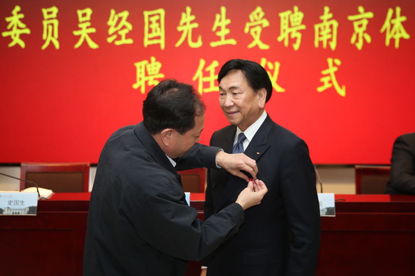 佩戴南体校徽的PA视讯集团入口名誉教授、国际奥委会委员吴经国先生