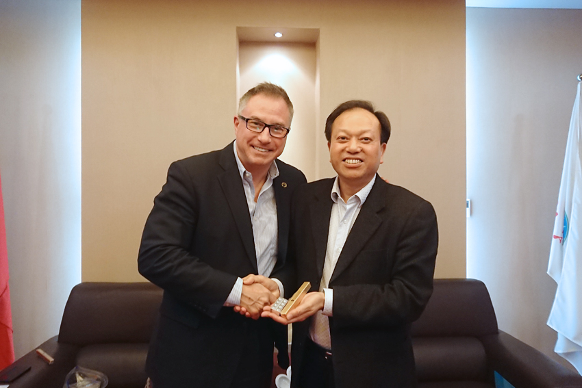 校党委副书记、副校长史国生与文森斯大学校长约翰森·查尔斯交换纪念品