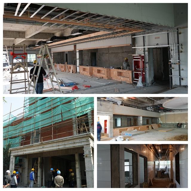 本月已完成外墙面粉刷、铝合金窗框安装、厨房后场水电预埋和墙砖铺贴、中央空调风机及管道安装、吊顶基层等工作,外墙贴砖完成80%。11月份将实施厨房后场防水、地砖铺设、大厅地砖铺设、吊顶面层、厨具设备安装、煤气管道改造、外排水管道施工、外墙脚手架拆除等工作。