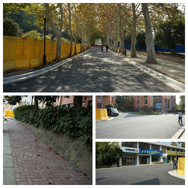 本月已完成校园南区南北主干道粗粒式沥青的铺设和原混凝土道路的修补工作,正在进行教学区和学生生活区的路牙和人行道的施工。计划11月底全部完成粗粒式沥青的铺设。