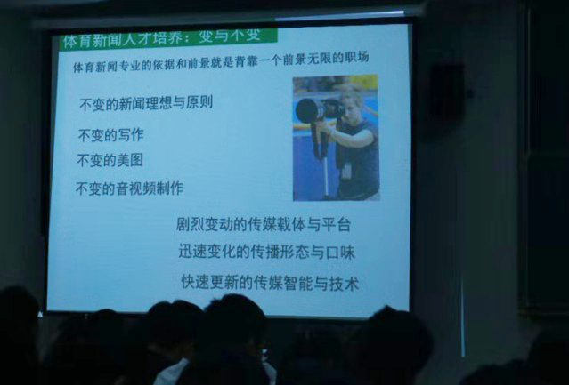 郝勤教授首先以“时代的问题,职场的问题,就是我们的问题”为开端,提出“网络信息能否取代新闻?”、“数字体育时代,还需要体育记者吗?”、“今天的职场需要什么样的体育记者?”等问题,引发在场师生们的思考与讨论,并重新梳理了中国体育媒介的发展历史,认为互联网改变了社会、改变体育,也改变了我们。随后郝勤教授以报纸、广播、电视等传统体育媒介的衰落为例,向同学们描绘了当前移动互联时代体育媒介发展的五大趋势,尤其强调了“短视频”将成为体育媒介的新风景:“体育短视频采编制作人将成为体育传媒新职业与新挑战。体育短视频内容将围绕体育明星、赛事精彩镜头和短视频故事展开。”